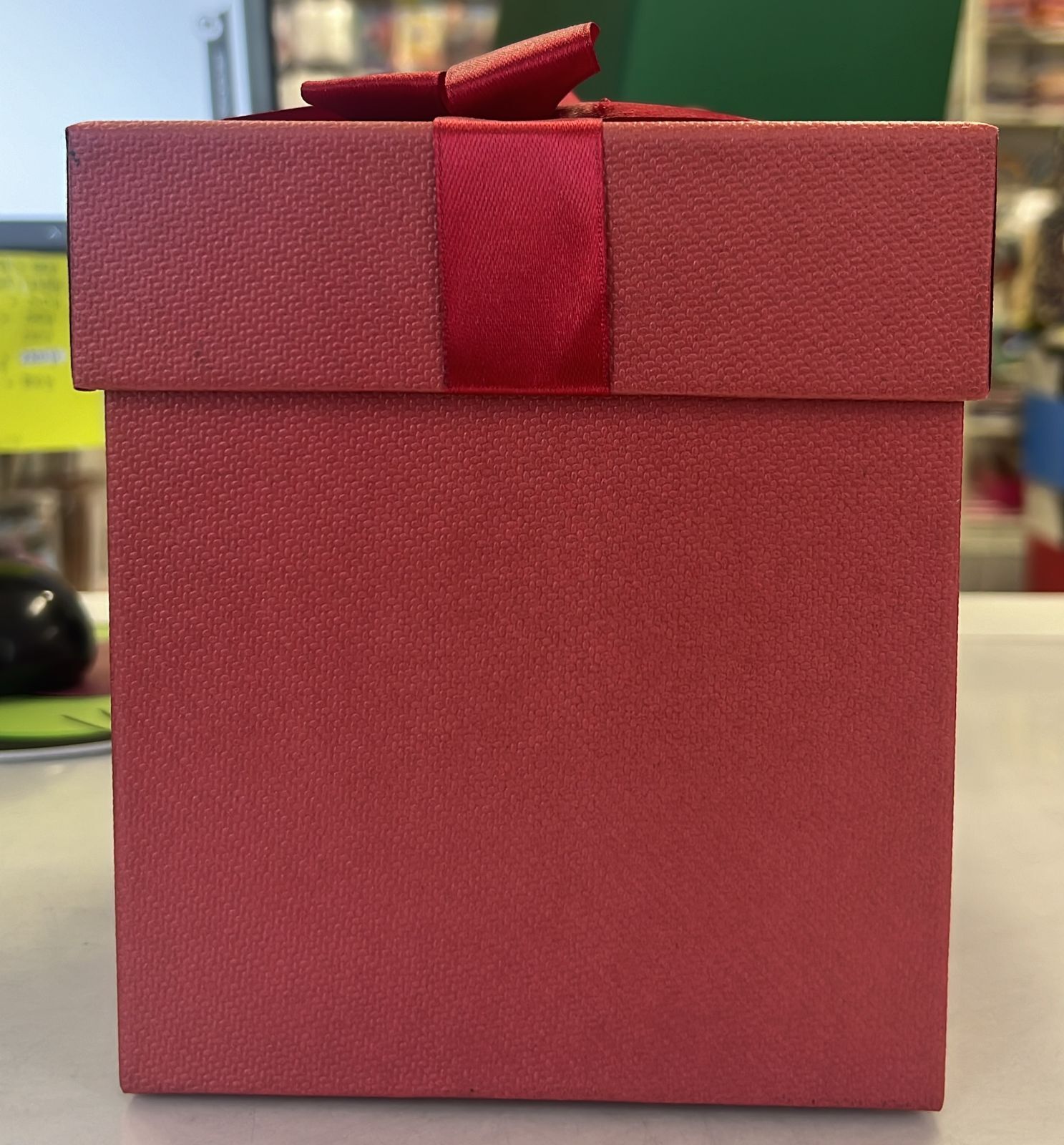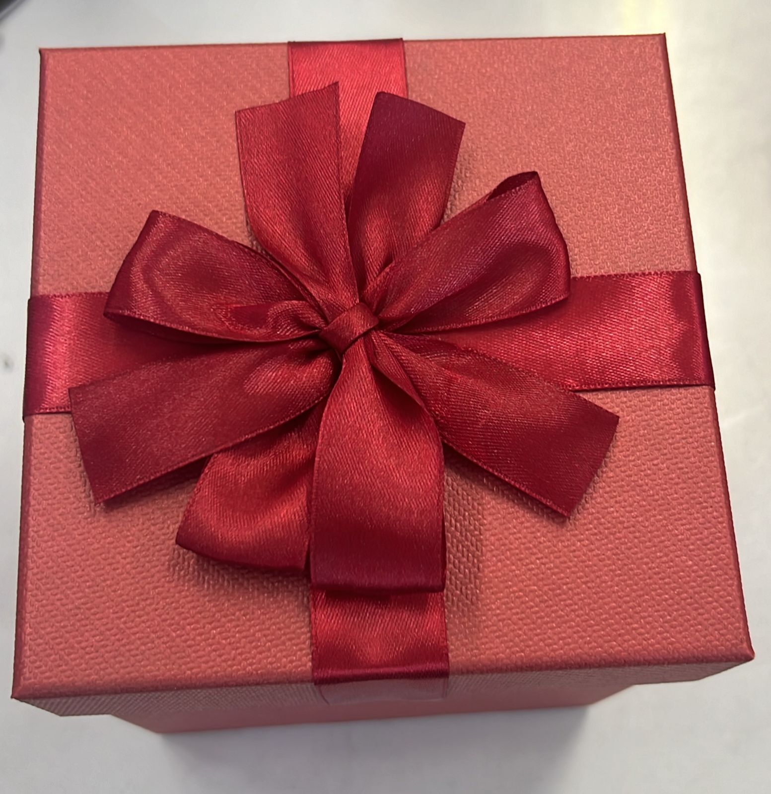 Коробка красная с бантом 16,5*16,5см, высота 18,5 см.