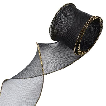 Лента декоративная (4 см*9,14 м) Органза с леской Золотая кайма Черный