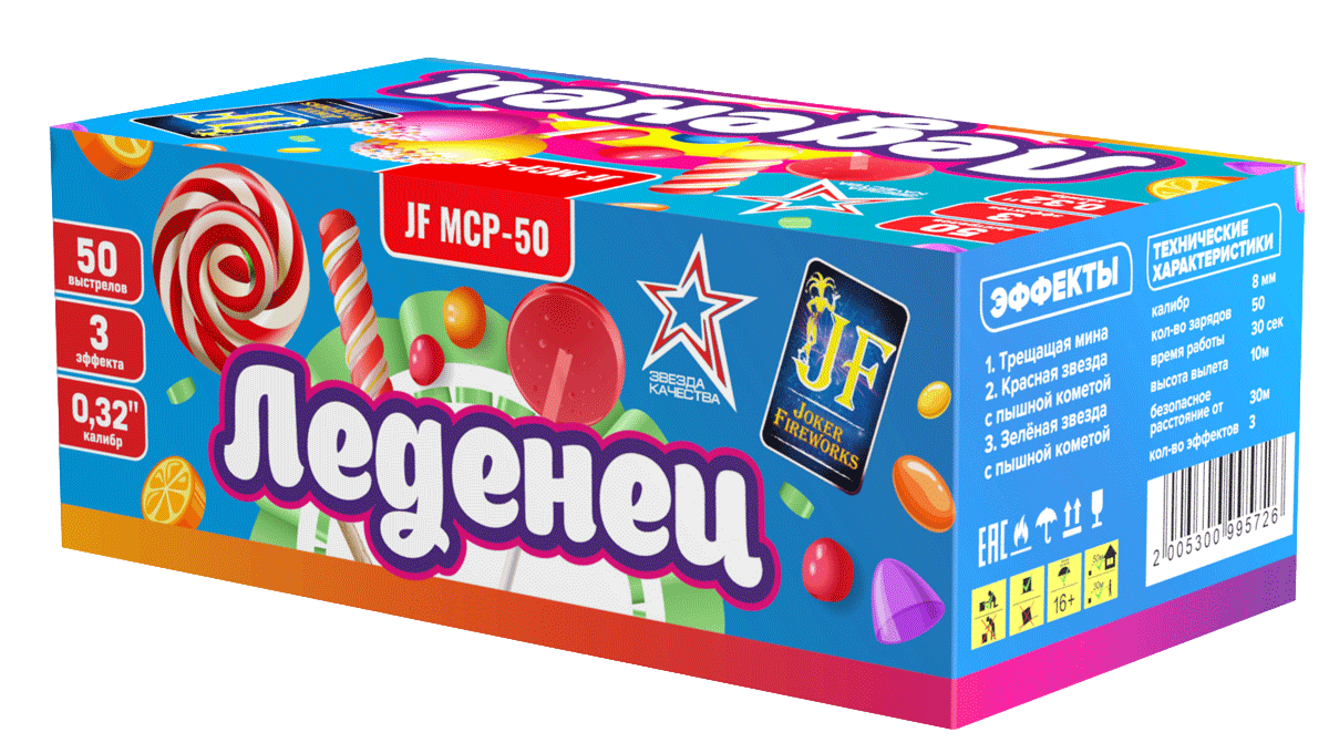 Описание эффектов: Трещащая мина, красная звезда с пышной кометой, зелёная звезда с пышной кометой.