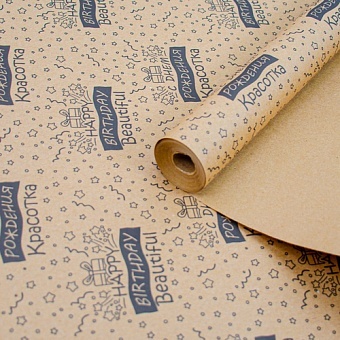 Упаковочная бумага, Крафт 40гр (0,7*1 м) С Днем Рождения, Красотка, Коричневый/Черный